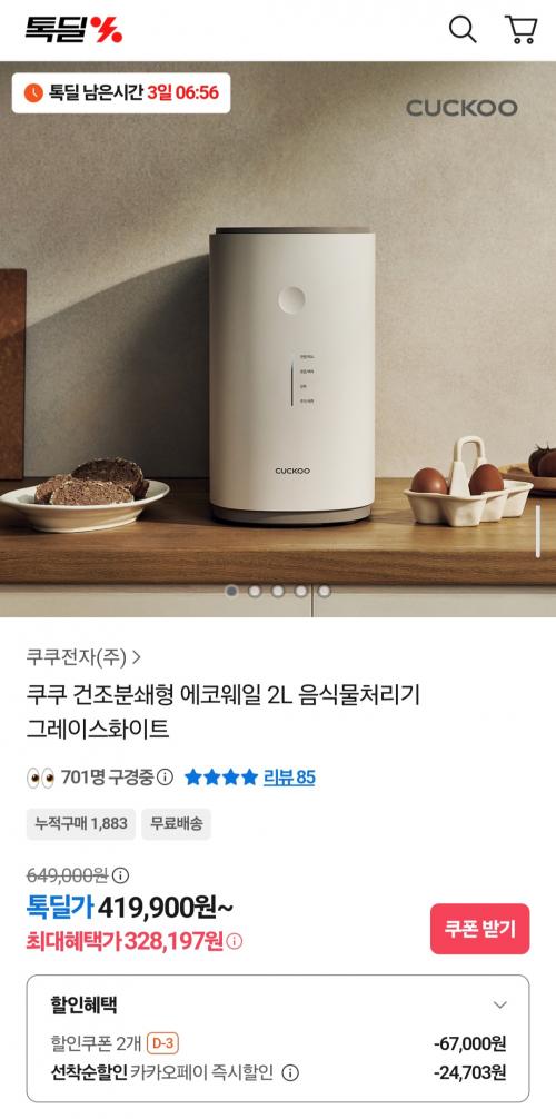 [카카오] 쿠쿠 강력분쇄 에코웨일 음식물처리기 (328,197원/무배) > 국내핫딜