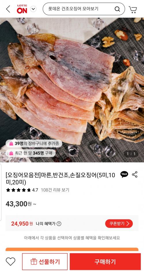 국산 마른오징어 5~8마리 준다고 하고 옵션에서 손질 오징어나 반건조 오징어도 있네요