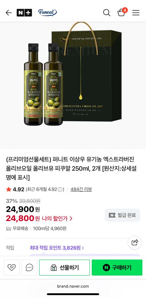 [네이버] 퍼니트 이상우 유기농 엑스트라버진 올리브오일 올리브유 피쿠알 250ml, 2개(24800/무배)