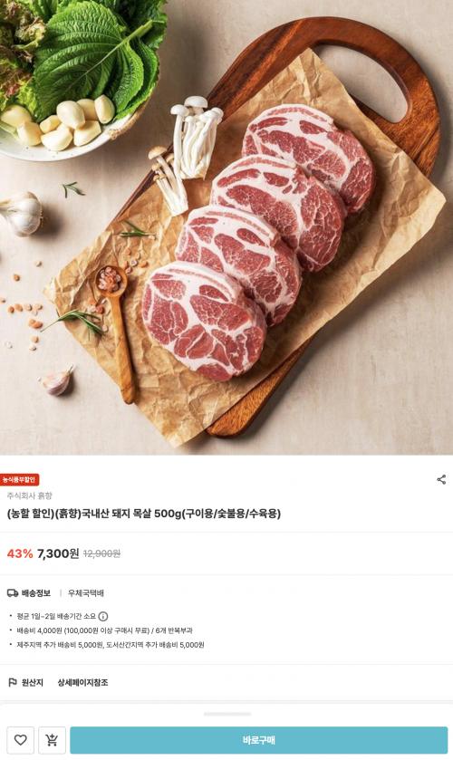 오늘 장보다가 발견한건데 국내산 돼지목살이 500g에 7,300원이더라구요