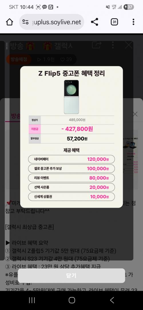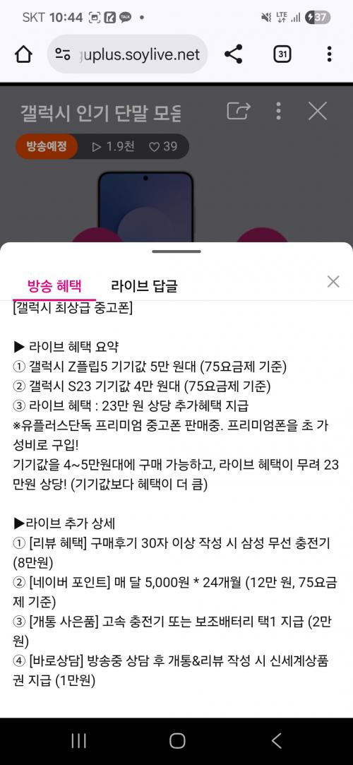 11시부터 라이브로 S23, Z플립5 최상급 중고폰 판매하는데 조건 괜찮은 것 같습니다.