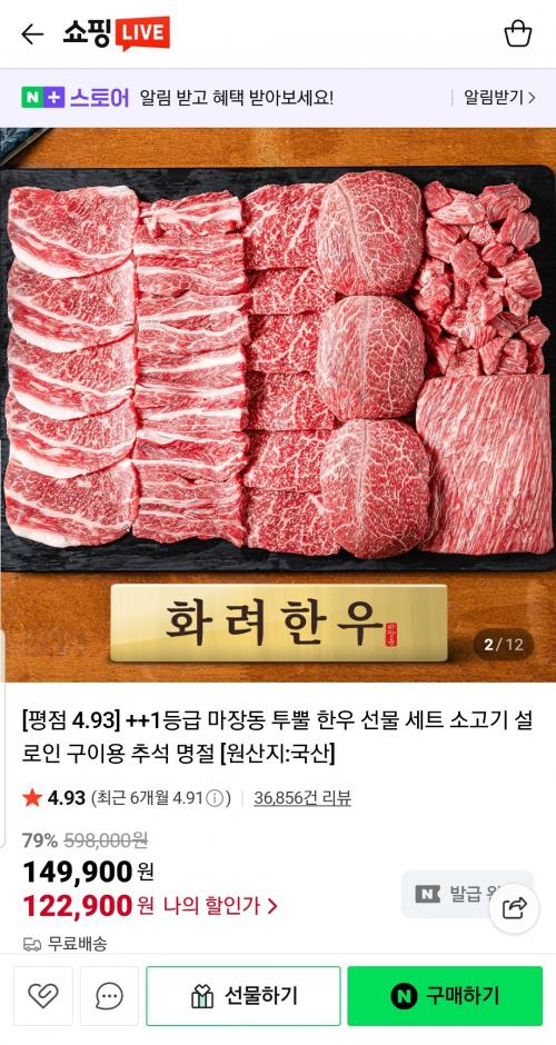 [네이버]화려한우 ++1등급 마장동 투뿔 한우 선물세트 다양 (122,900원/무료) > 국내핫딜