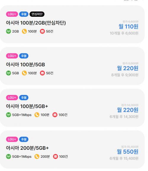 3. 아시아 100GB+(쿠폰 5천) : https://asiamobile.kr/view/price/pricePlan_detail.aspx?gdcd=LPZ1006027