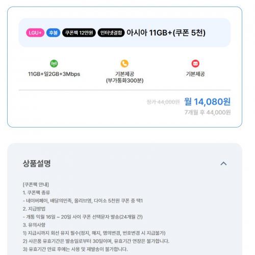 2. 아시아 11GB+(쿠폰 5천) : https://asiamobile.kr/view/price/pricePlan_detail.aspx?gdcd=LPZ1006032
