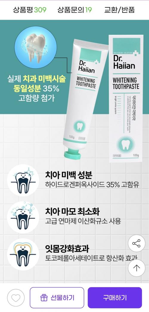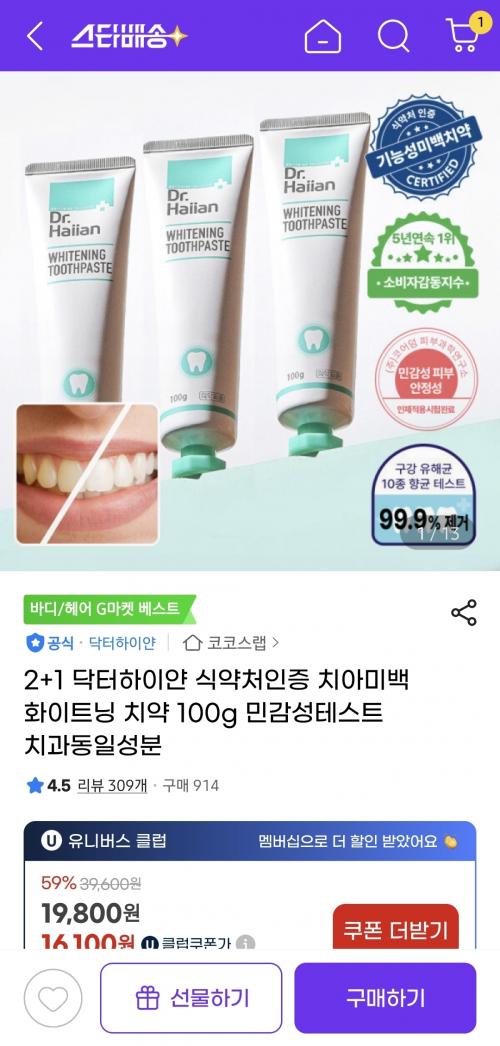 [지마켓] 식약처인증 치아미백 화이트닝 치약 2+1 (16900/무배) > 국내핫딜