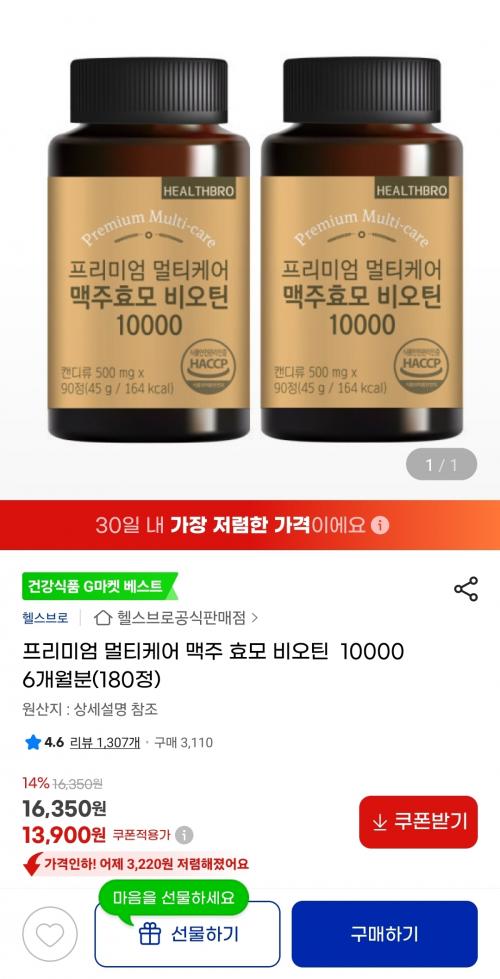 [지마켓] 프리미엄 멀티케어 맥주효모 비오틴 10000 6개월분 (13,900원/무배) > 국내핫딜