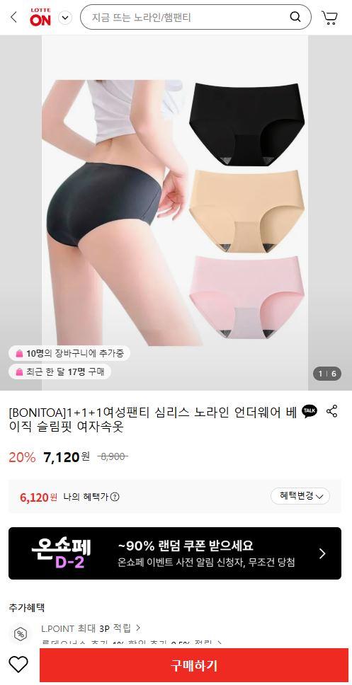 [롯데온] 3매입 무봉제 심리스 노라인 여성팬티 (6,120원/무배) > 국내핫딜