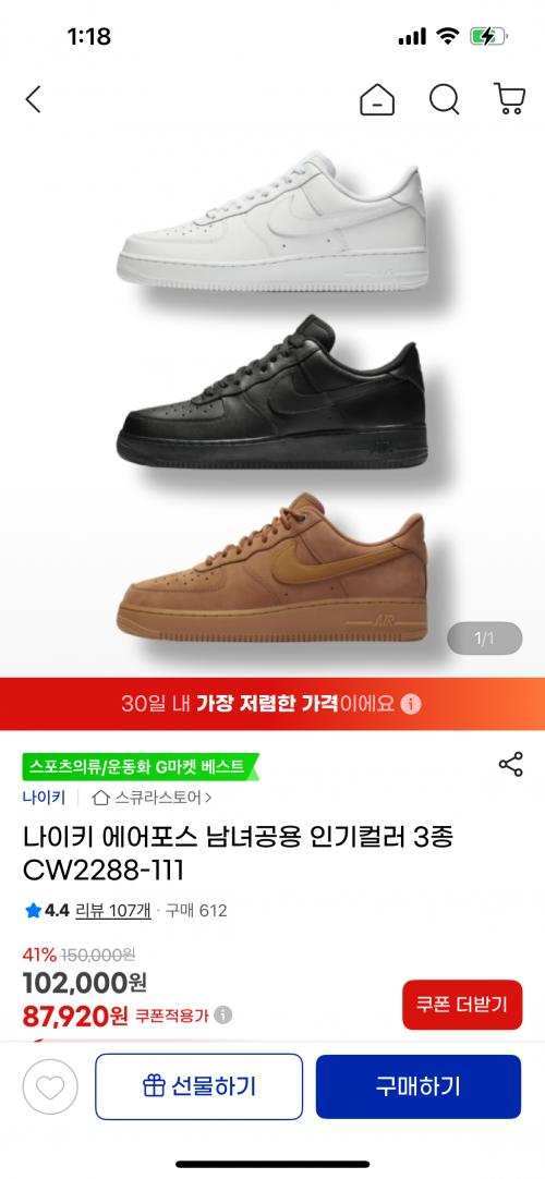 [지마켓] 나이키 에어포스 인기컬러 3종 (87,920원/무료) > 국내핫딜