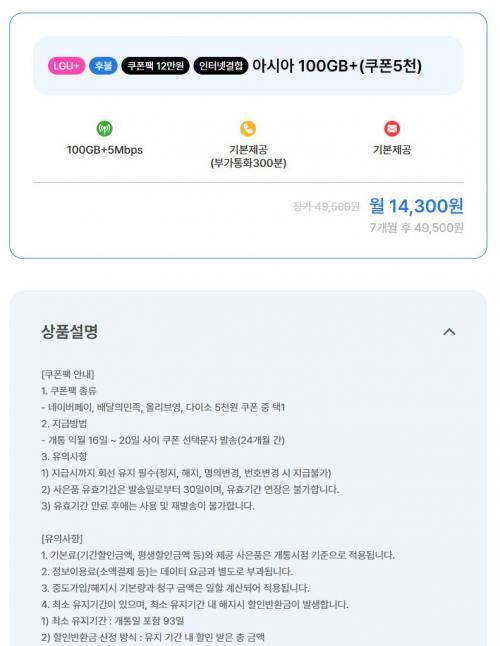 데이터 100GB+5Mbps (7개월) 체감가 9,300원