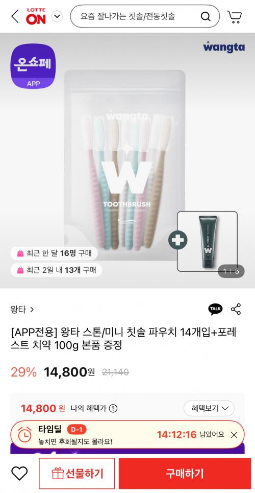[롯데온] 왕타 스톤/미니 칫솔 파우치 14개입+왕타 포레스트 치약100g 증정 (14,800원/무료) > 국내핫딜