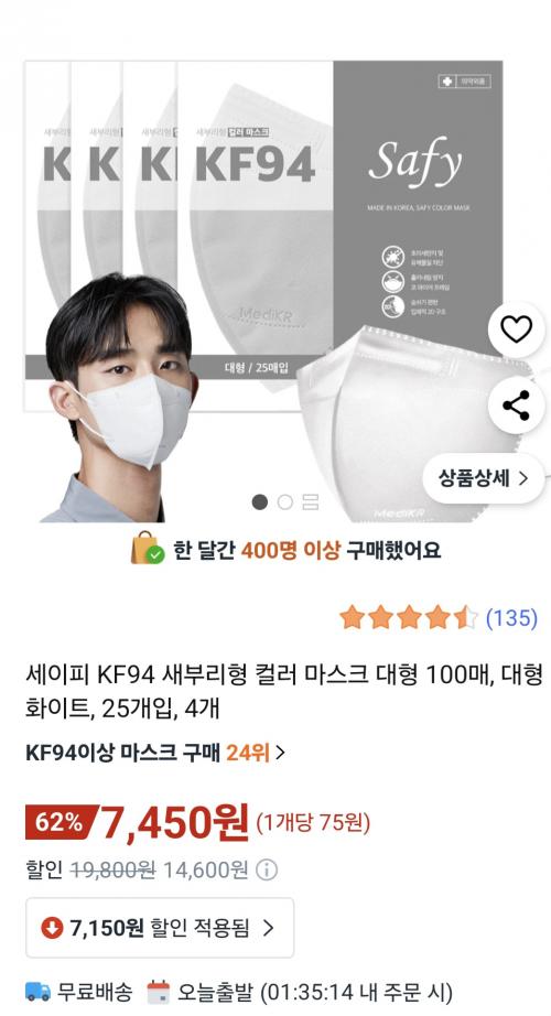 [쿠팡]세이피 KF94 국산 새부리형 컬러 마스크 대형 100매 (7450/무배) > 국내핫딜