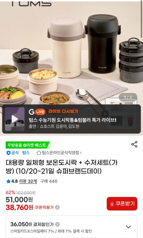 [지마켓] 텀스 대용량 일체형 보온도시락 + 수저세트(가방) (36,050d원/무배) > 국내핫딜