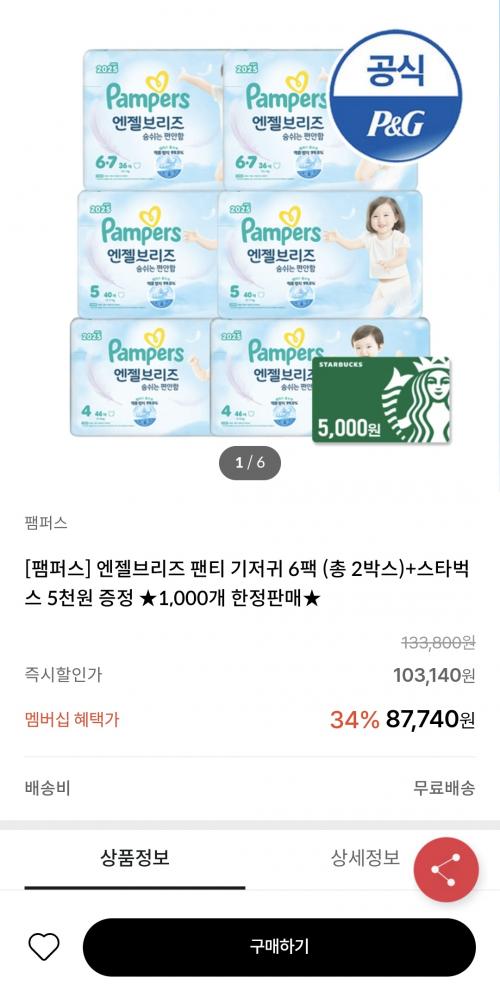 [KT멤버십] 팸퍼스 엔젤브리즈 팬티 6팩 2박스 (77,430원/무료)