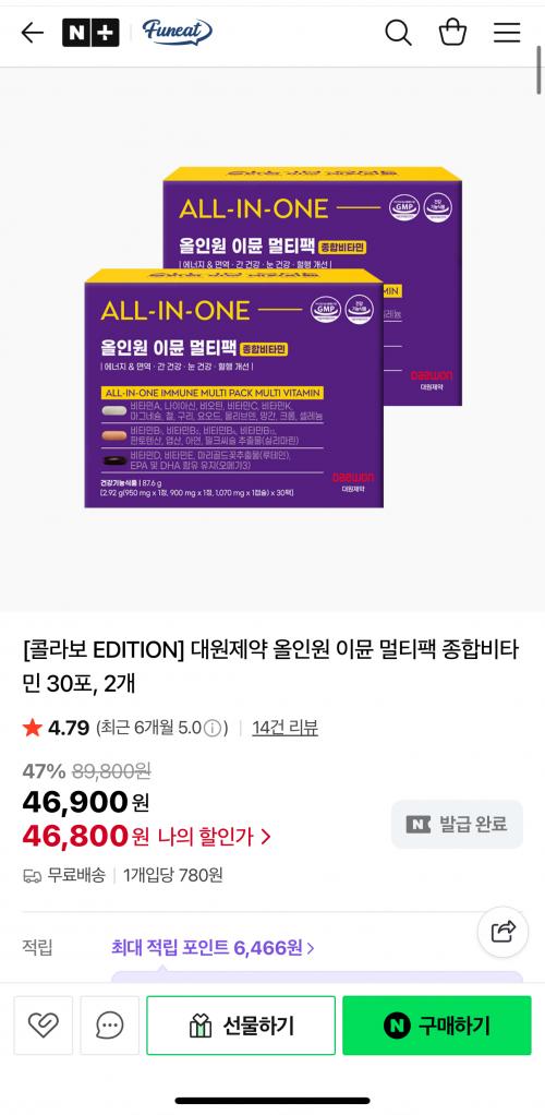 [네이버]퍼니트 대원제약 올인원 이뮨 멀티팩 종합비타민 30포, 2개 (46900/무료) > 국내핫딜