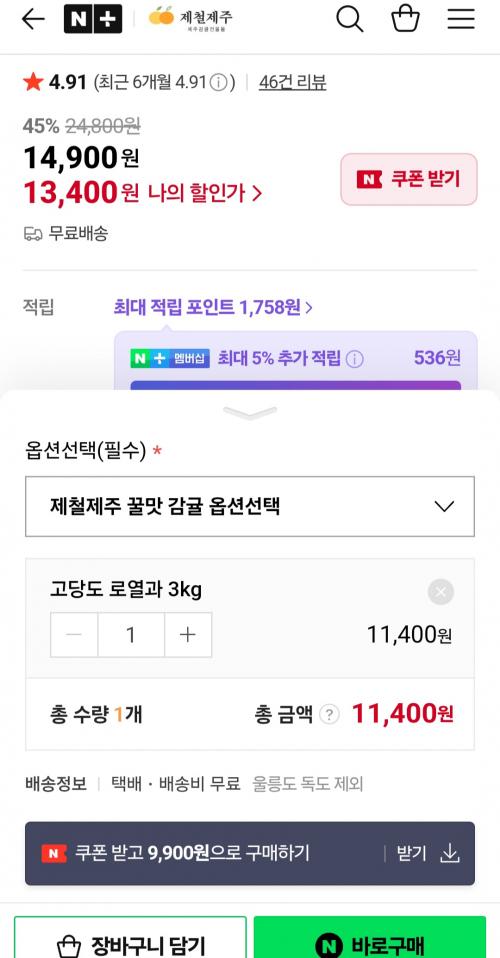 [네이버] 제주 극조생 감귤 3kg (9,900원/무료)