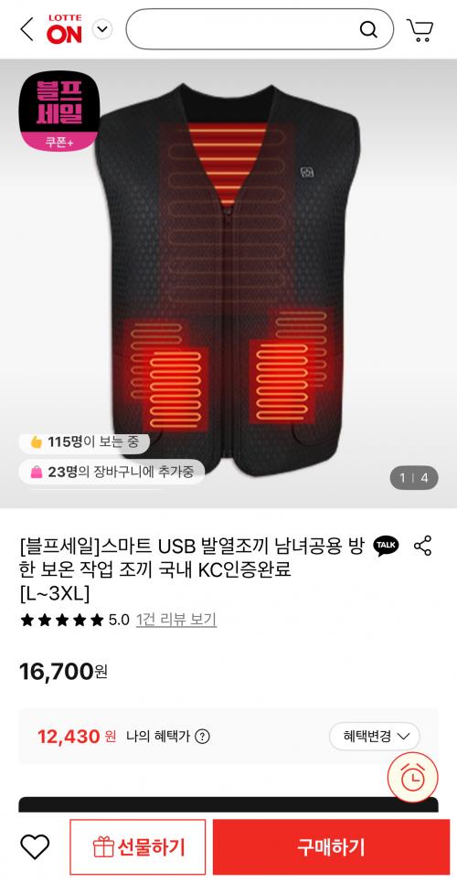 [롯데온] 스마트 USB 발열조끼 공용 방한보온 작업조끼 KC인증 (12,430원/무료) > 국내핫딜