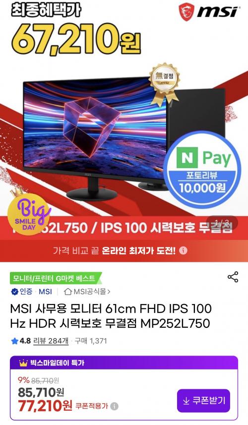 24인치 MSI 모니터 최종 6만원대 나오네요ㄷㄷ