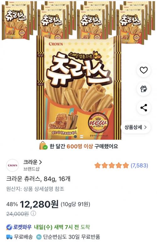 [쿠팡] 크라운 츄러스 84g 16개 (12,280원/와우무료)