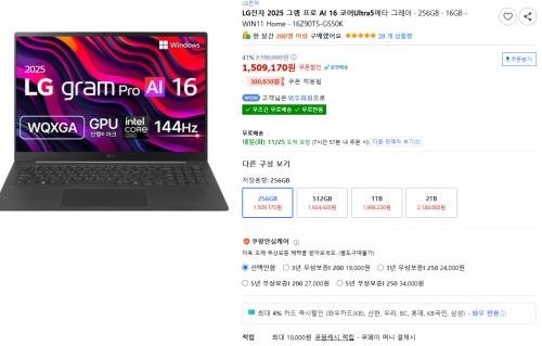 [쿠팡] 엘지 그램 Pro 16Z90TS-GS50K (1,509,170/무료)