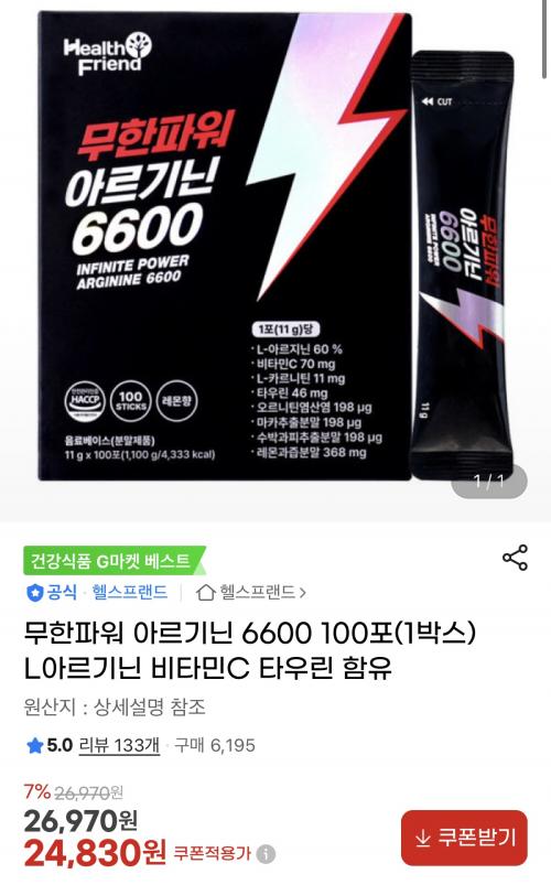 [지마켓] 무한파워 고함량 아르기닌 6,600mg 대용량 100포 (24,830원/무료) > 국내핫딜