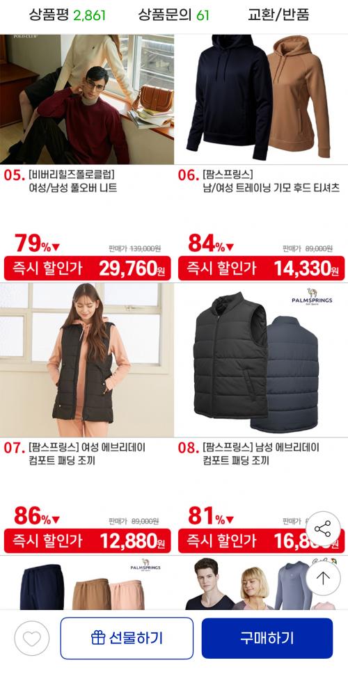 팜스프링스 기모후드 1.4만원대, 패딩팬츠 1.7만원대
