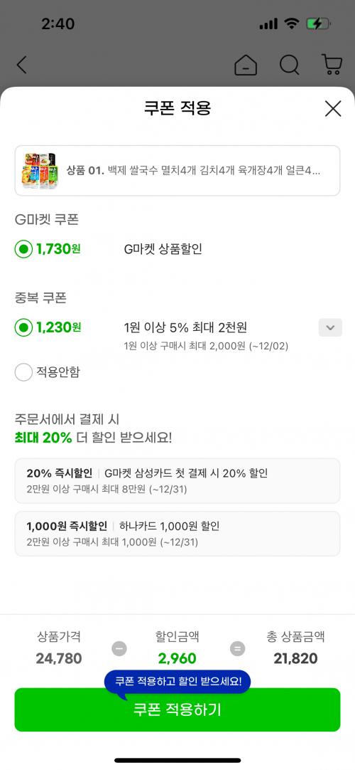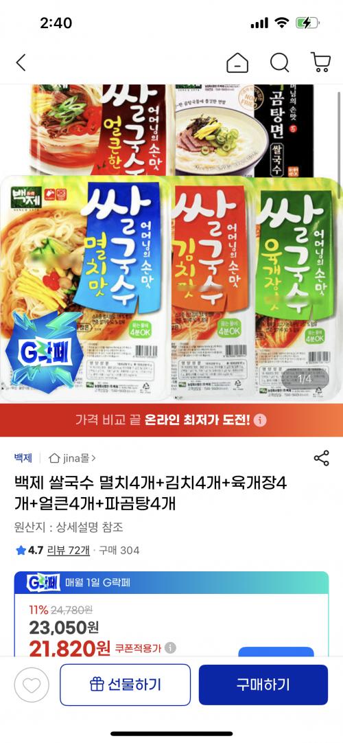 [g마켓] 백제 쌀국수 멸치4개+김치4개+육개장4개+얼큰4개+파곰탕4개 (21,820/무) > 국내핫딜