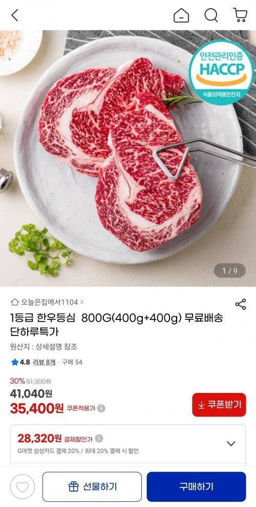 [지마켓] 농협안심한우 1등급 등심 800g (35,400원/무배) > 국내핫딜