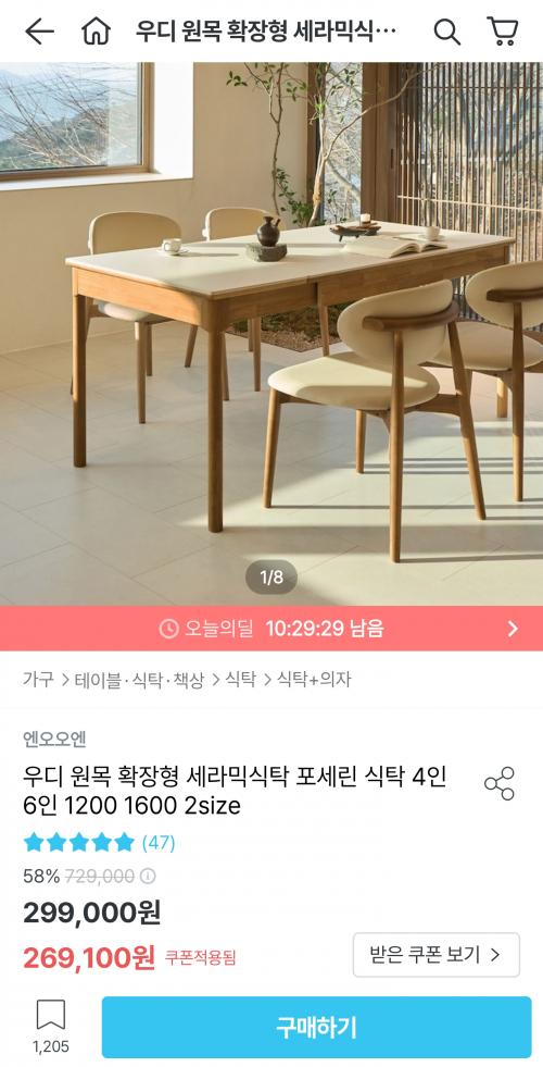 [오늘의집] 우디 원목 확장형 세라믹식탁 포세린 식탁 4인 6인 1200 1600 2size (255,645원/무료) > 국내핫딜