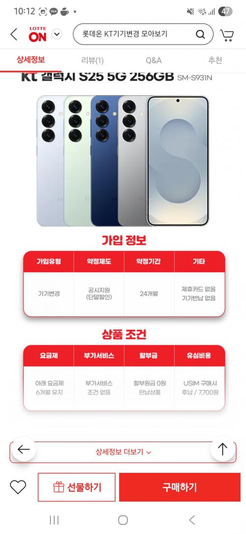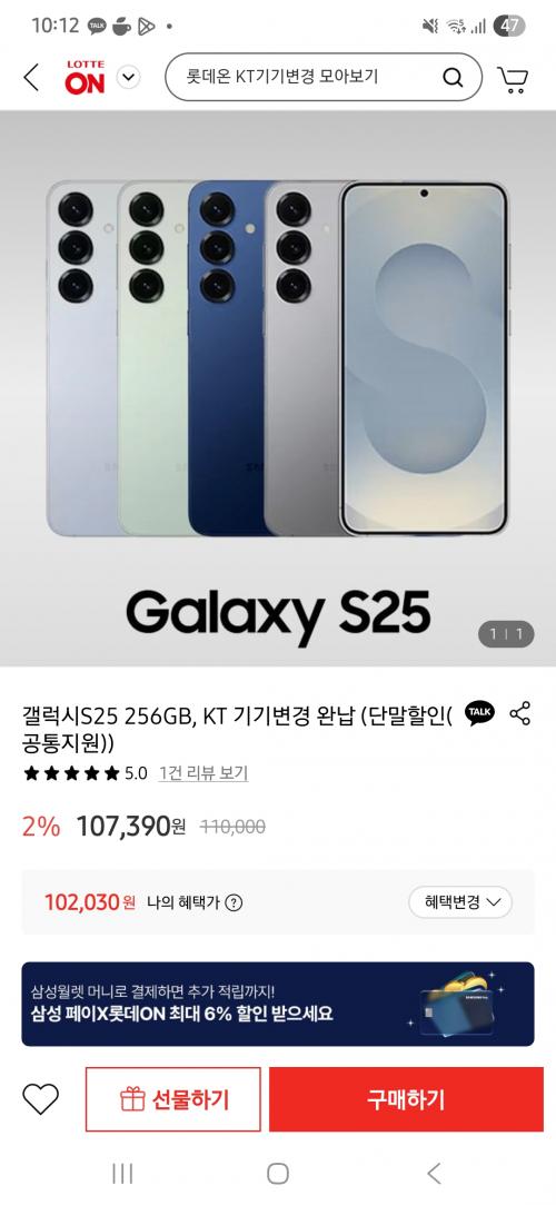 [롯데온] 갤럭시S25 256GB, KT 기기변경 완납 (107390/무료)