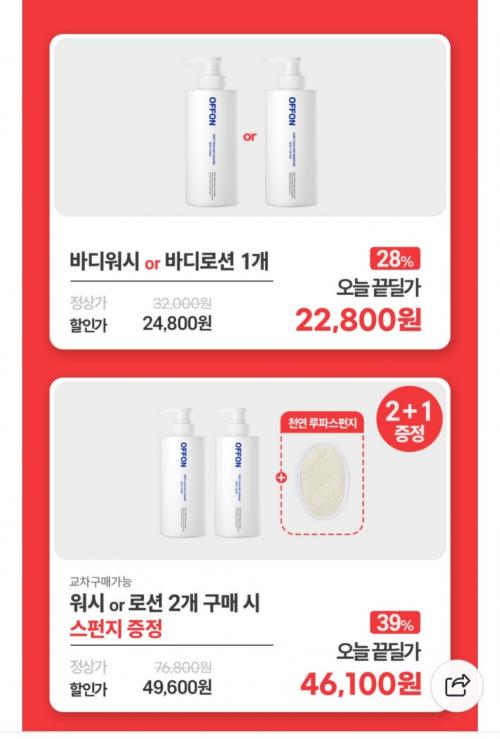 오프온 바디워시 오늘끝딜로 22,800원 무배입니다