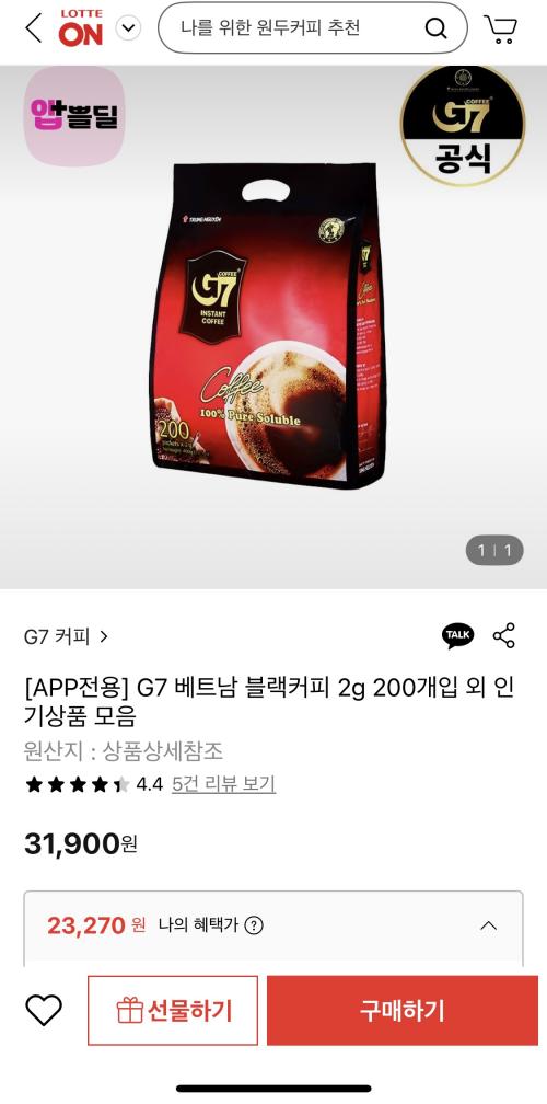 [롯데온] g7 블랙커피 200개 (23,270원/무배) > 국내핫딜