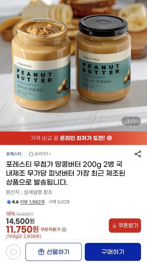 [지마켓] 포레스티 무첨가 땅콩버터 200g 2병 (11,750원/무배) > 국내핫딜