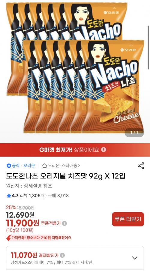 [지마켓] 도도한나쵸 오리지널 치즈맛 92g X 12입 (11,900원/유클무료)