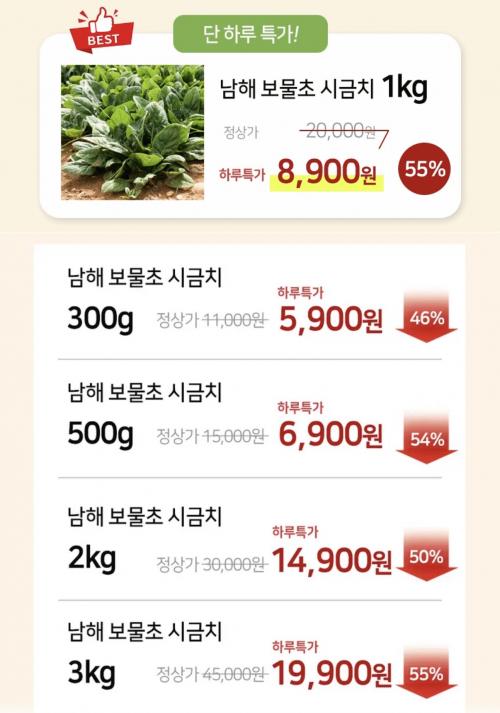 시금치 맛있을때네요 남해산이고 하루 특가중이라 300g 5,900원, 500g 6,900원, 1kg 8,900원입니다