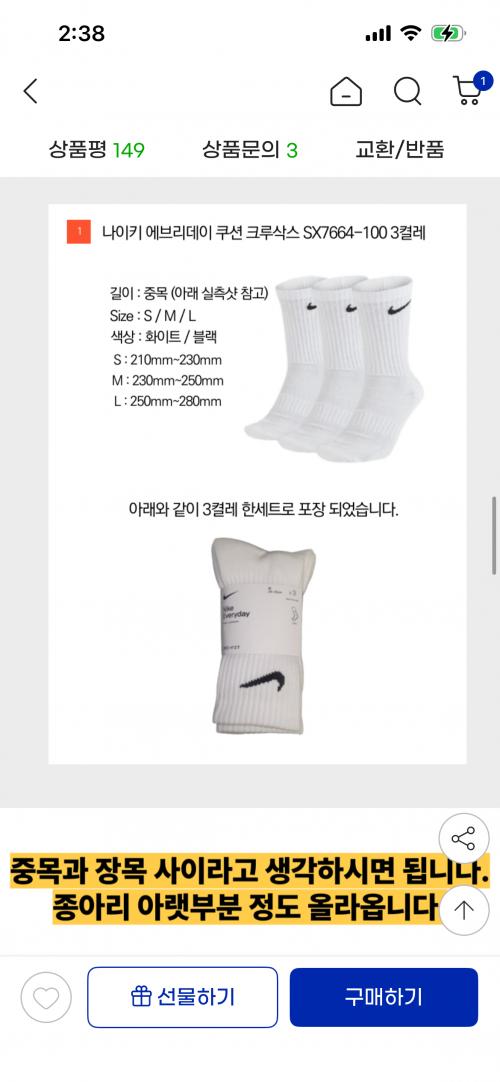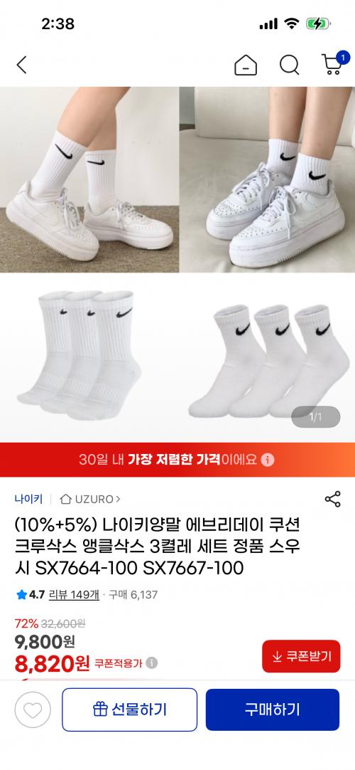 [g마켓] 나이키양말 에브리데이 쿠션 크루삭스 앵클삭스 3켤레 (8,820원/무료)