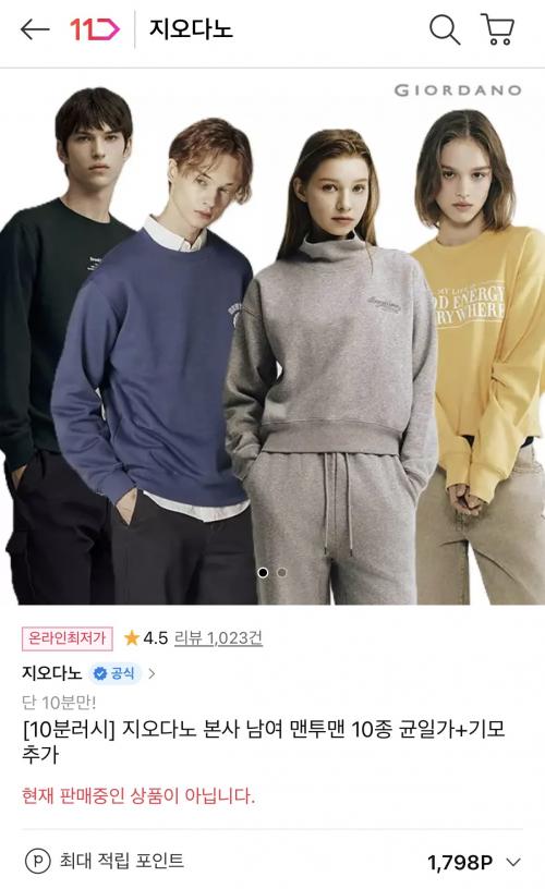 [11번가](10분러시) 지오다노 맨투맨 10종 균일가 (14,800원/무료)