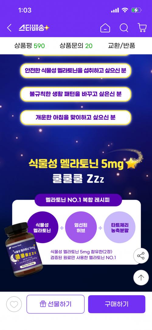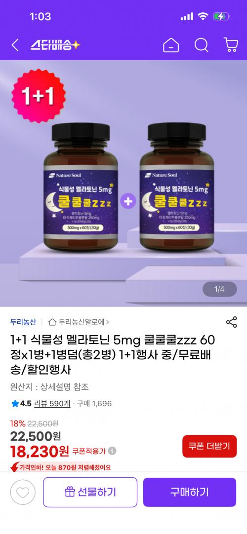 [g마켓] 1+1 식물성 멜라토닌 5mg 2병 (총 120정) (18,230원/무료) > 국내핫딜