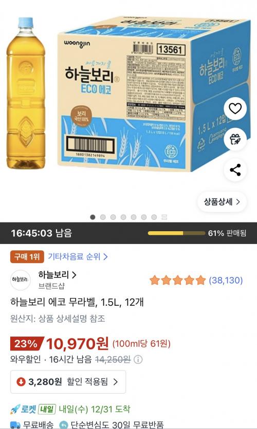 [쿠팡와우] 하늘보리 에코 무라벨 1.5L 12개 (10,970원/무료)