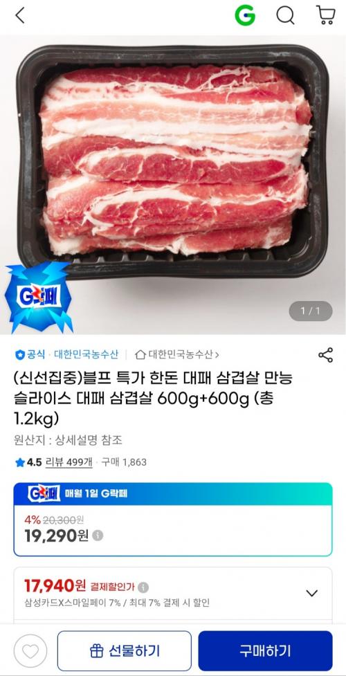가성비 좋은 한돈 대패 삼겹살 600g 1+1 19,290원 무료배송 > 국내핫딜