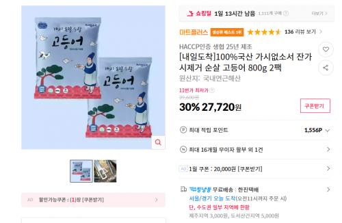 즉할30%+장바구니5%(최대천원)+신한카드1% 최종가 26460원으로 가격대 좋게떠서 올려봅니다 고등어 자체가 비린맛도없고 싱싱해서 좋더라고요