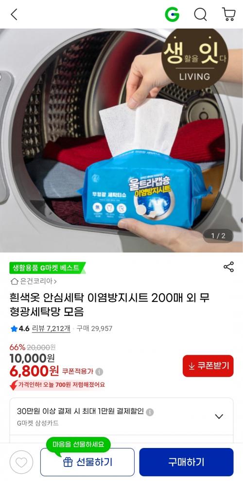 [지마켓]흰색옷 안심세탁 이염방지시트 200매 외 무형광세탁망 모음 6800원 / 무배 > 국내핫딜