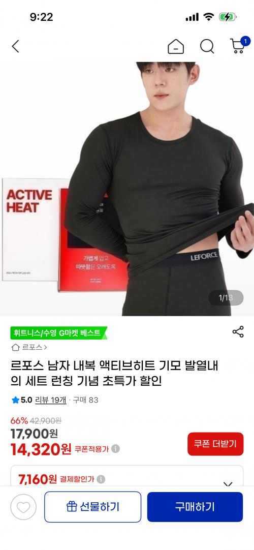 [지마켓] 르포스 남자 내복 액티브히트 기모 발열내의 세트 (14,320원/무료) > 국내핫딜