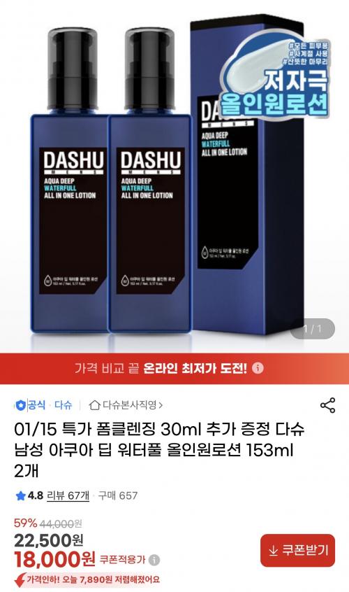 [지마켓] 다슈 남성 아쿠아 딥 워터풀 올인원로션 153ml*2+폼클30ml(18,000원/무배) > 국내핫딜