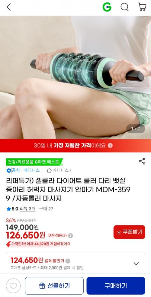 [지마켓] 메디니스 리퍼 셀룰라 롤러마사지기 (126,650원 / 무료배송) > 국내핫딜