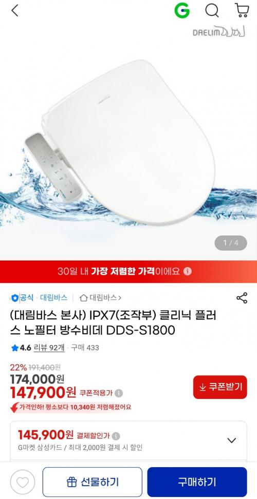 [지마켓] 클리닉 플러스 노필터 방수비데 (147,900원 / 무료배송) > 국내핫딜