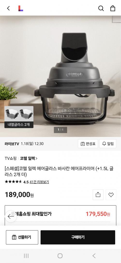 [롯데홈쇼핑] 코렐 일렉 에어글라스 바사칸 에어프라이어 (189,000원/무료)