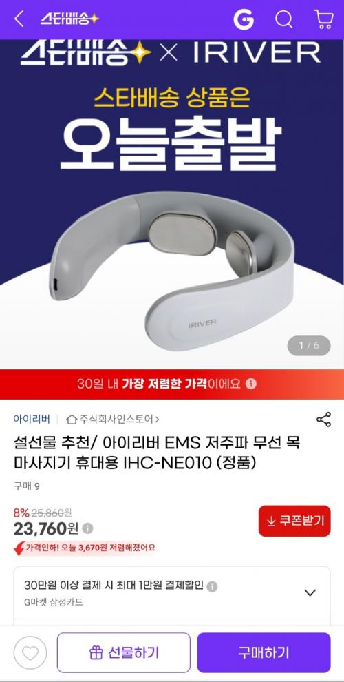 [지마켓] 아이리버 EMS 저주파 무선 목 마사지기 휴대용 (23,760원 / 무료배송) > 국내핫딜