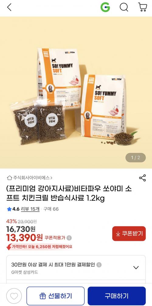 [지마켓] 비타파우 쏘야미 소프트 치킨크릴 반습식사료 1.2kg (13,390원/무료)