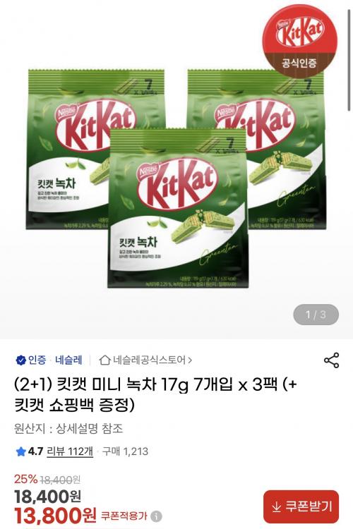 [지마켓] 킷캣 미니 녹차 17g 7개입 3팩 (2+1) (13,110원/무료)