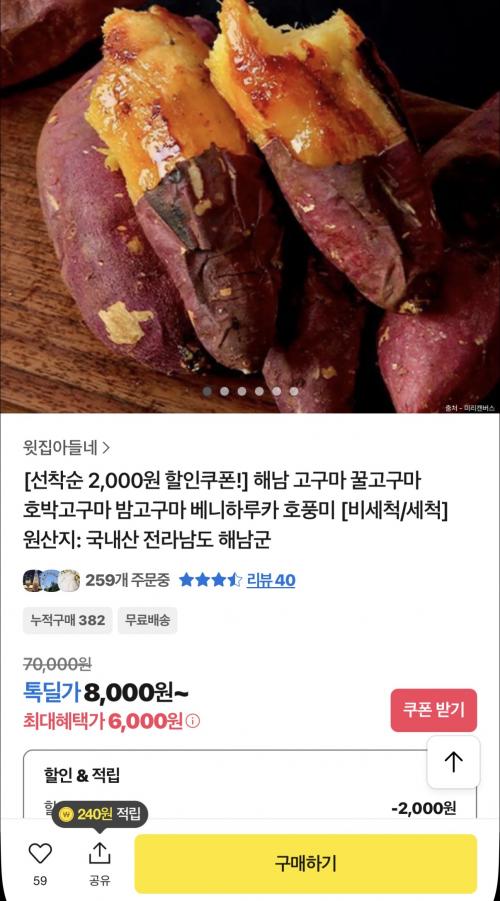 [카카오] 해남 꿀고구마 한입사이즈2kg (6,000원/무료배송) > 국내핫딜